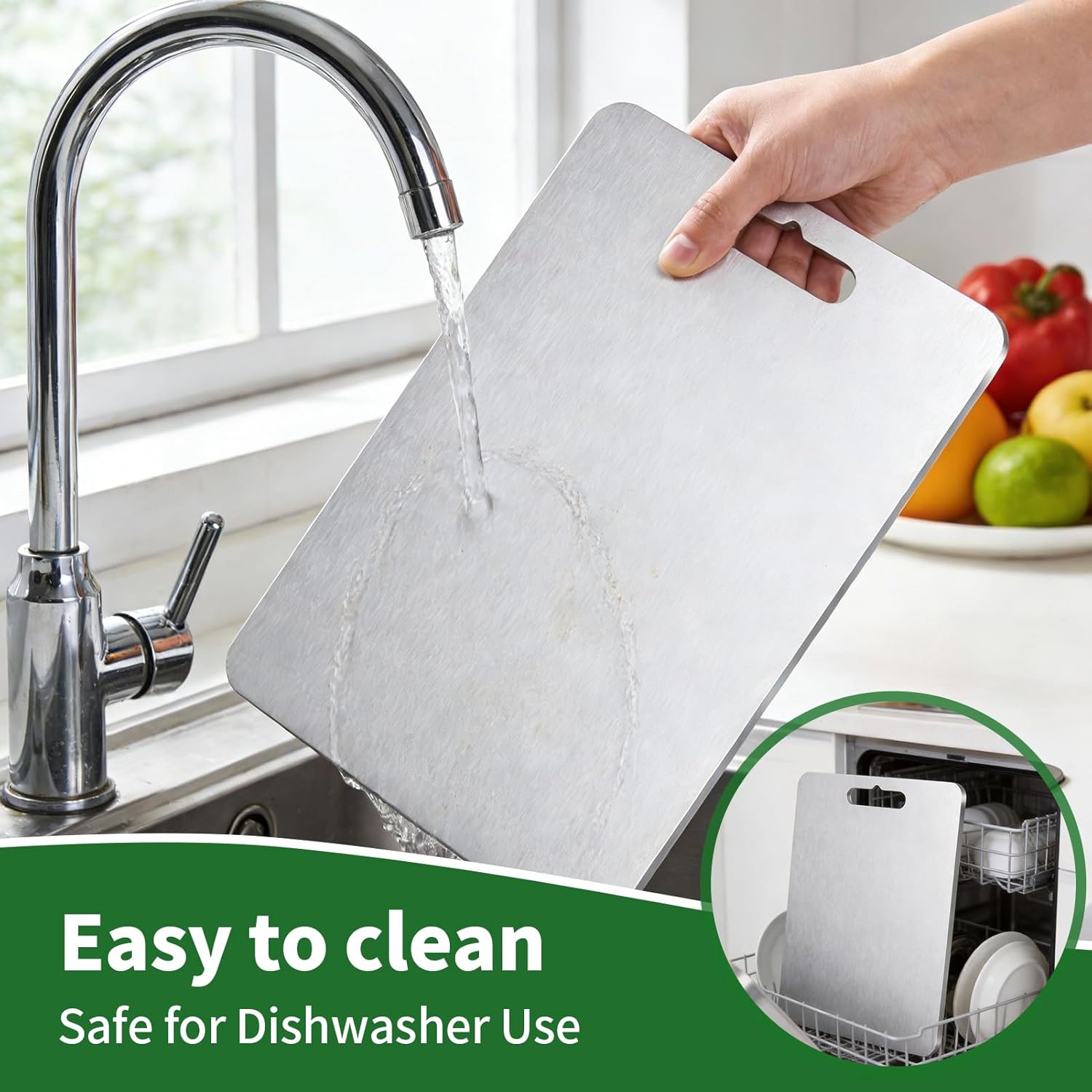 【Titanium Strength for Lasting Use】Experience the resilience of high-quality, food-grade titanium with our cutting board. Built to withstand the demands of daily meal preparation, its exceptional strength ensures a reliable and long-lasting kitchen companion. This durable material provides a consistently safe and clean surface for all your culinary tasks. 【Dual-Sided Versatility】Maximize efficiency and maintain hygiene with our smart dual-sided design. This thoughtful layout not only organizes your workspace but also minimizes odor transfer, thanks to the non-absorbent nature of the titanium surface. 【Healthier and Safer】Our cutting boards are made of 100% pure titanium, which is a trusted material for surgical implants. Unlike wooden and plastic cutting boards, pure titanium cutting board do not absorb liquids, and are easy to clean,do not leave any odors or subtle food residues, making them a healthy choice for your kitchen 【Blade-Care Technology】Your fine knives deserve the best. Our cutting board features a specially engineered surface that is remarkably gentle on blade edges. By significantly reducing friction and impact, it helps preserve the sharpness and integrity of your knives, making every cut, slice, and chop precise and effortless. 【Effortless Hygiene & Care】Simplify cleanup with our non-porous. For daily maintenance, a quick rinse under water is all it takes. For a more thorough clean, the board is dishwasher-safe, guaranteeing a hygienic surface with minimal effort after every use.