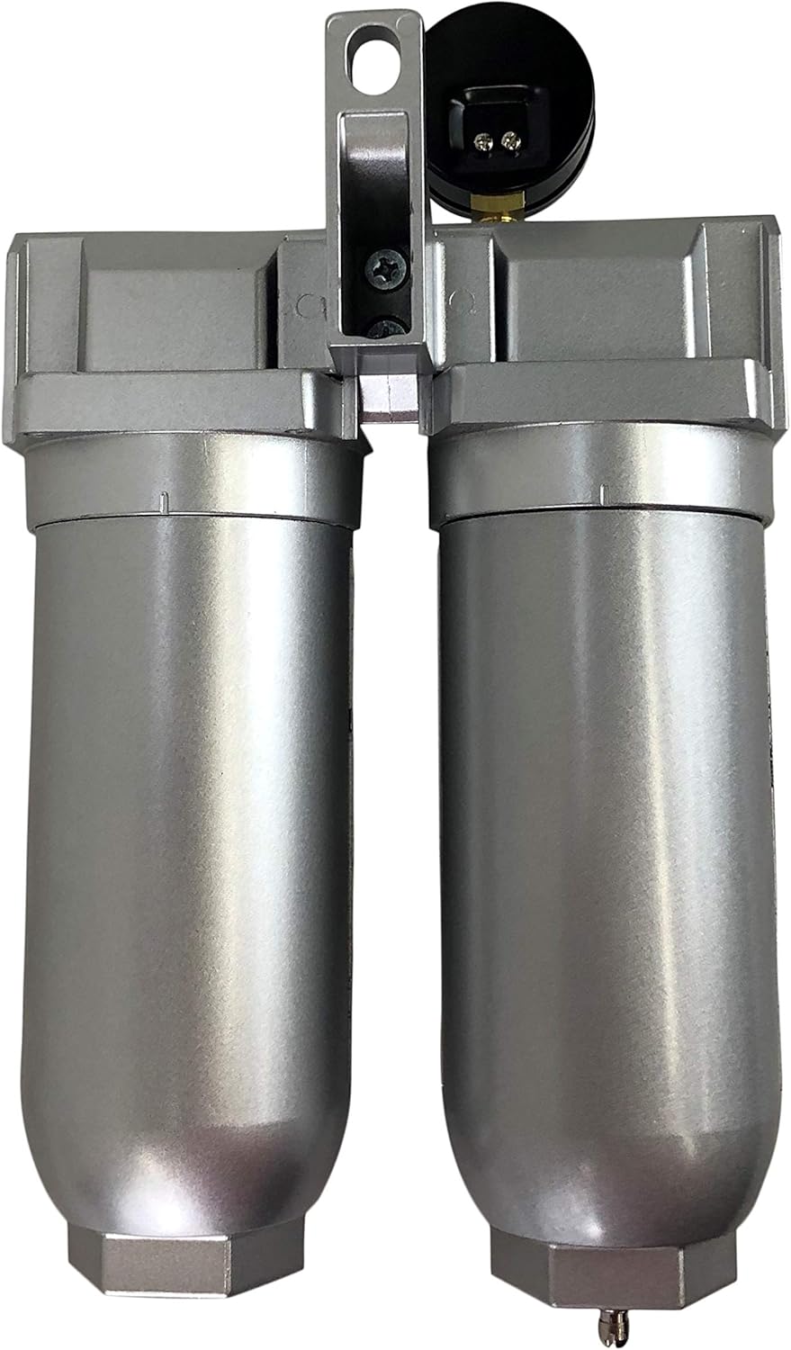 This listing is for a large body, industrial grade 3/4" NPT coalescing filter / oilesser. This filter is used to remove oil from your air compressor air-line system. This filter features one 3/4" NPT inlet port and one 3/4" NPT outlet port. The max air flow for this filter is up to 200 SCFM. This coalescing filter has an easy twist drain at the bottom to empty it when it is full and it also has a PSI gauge on top to check what pressure you have running into the filter. There is a clear window on the bowl for easy viewing of oil level. This is a must have for painting, sandblasting, and other compressed air uses to remove oil, and oil aerosols from your compressed air. Replacement filters are available when needed. Specifications: 3/4" Inlet Port 3/4" Outlet Port 200 SCFM Max Flow .01 MICRON FILTER Aluminum Bowl 225 MAX PSI Sturdy Metal Construction Easy Twist Drain Great for painting, plasma cutters, sandblasting and more! Specifications: Max pressure: 225 PSI / 15.5 Bar Air inlet and outlet: 3/4" Female NPT (measure about 1" in diameter) Total filter Width: 4.5" x 3.5" with Wall Mounting Bracket Total filter height: 10-1/8" Filter is directional flow and is marked; each port is marked In & Out. l Paint Spray Gun (gravity, siphon, and pressure feed styles) l Air measuring instruments (requiring clean, dry air) Function l Coalescing filter - removes oil vapors, which can get past standard filters and water separators. l Desiccant dryer – reduces humidity in compressed air lines, a MUST HAVE for paint spraying operations. l The Red Service Indicator will rise when filter element needs to be changed. l Desiccant beads change color from blue to pink when they to be changed or reactivated. l 0.01μ filter element removes 99.9% of oil vapor particles.