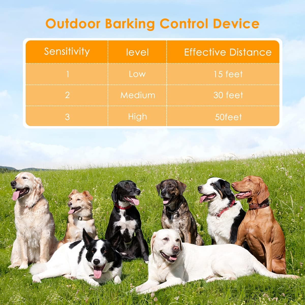 [ Description ] 1. This antibarking device was built to offer pet owners more professional ways to train their pets. 2. It is powered by a 9volt battery replaceable battery which you insert into the unit. With the aid of an internal microphone that picks up dog bark, Outdoor Bark Control is automatically activated when it detects barks up to 50 feet away. It then emits an ultrasonic sound. 3. On hearing this highpitched sound, the dog immediately stops barking as it will associate its bark with this unpleasant noise. When the dog stops barking the ultrasonic sound also stops. 4. The new outdoor bark control has 4 range levels including a test mode. It has 2 LEDs to indicate a good or bad battery. 5. The New Outdoor Bark Control comes in a beautiful, welldesigned birdhouse unit. [ Features ] 1. Defer noisy barking by harmless ultrasonic sound. 2. Range up to 50 feet. 3. Four adjustable ultrasonic volume levels(including a test mode). Testused to verify the microphone and speaker are functional. Low Rangeup to 15 feet/5 meters (Suggest testing indoors). Medium Rangeup to 30 feet/10 meters. High Rangeup to 50 feet/15 meters. 4. Dural and weatherproof for outdoor use. 5. LED light flashes for low battery indication. 6. 9V Battery operation (battery not included). [ Package Includes ] New Outdoor Bark Control (battery not included) and manual. [ Caution ] Keep at one arm's length away from the human ear(s) to avoid hearing damage if a dog begins barking while you are setting up, mounting or hanging the New Outdoor Bark Control. [ Note ] If the dog is deaf or hearing impaired, he may not react to the Outdoor Bark Control.