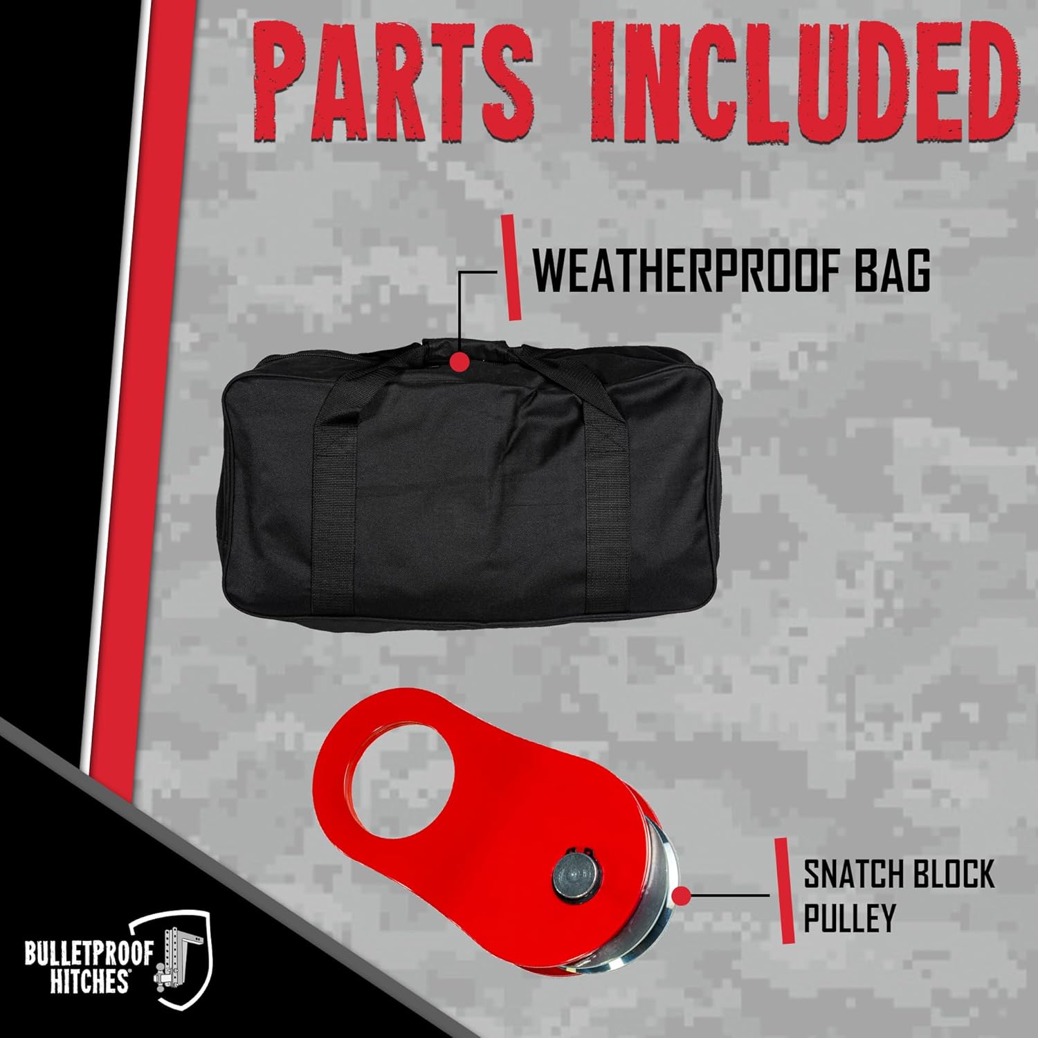 | Included Components | 10' Snatch Strap, 65' Snatch Strap, 30' Snatch Strap, 10' Snatch Strap, D-ring Shackles, Folding Shovel, leather gloves, Snatch Block Pulley |