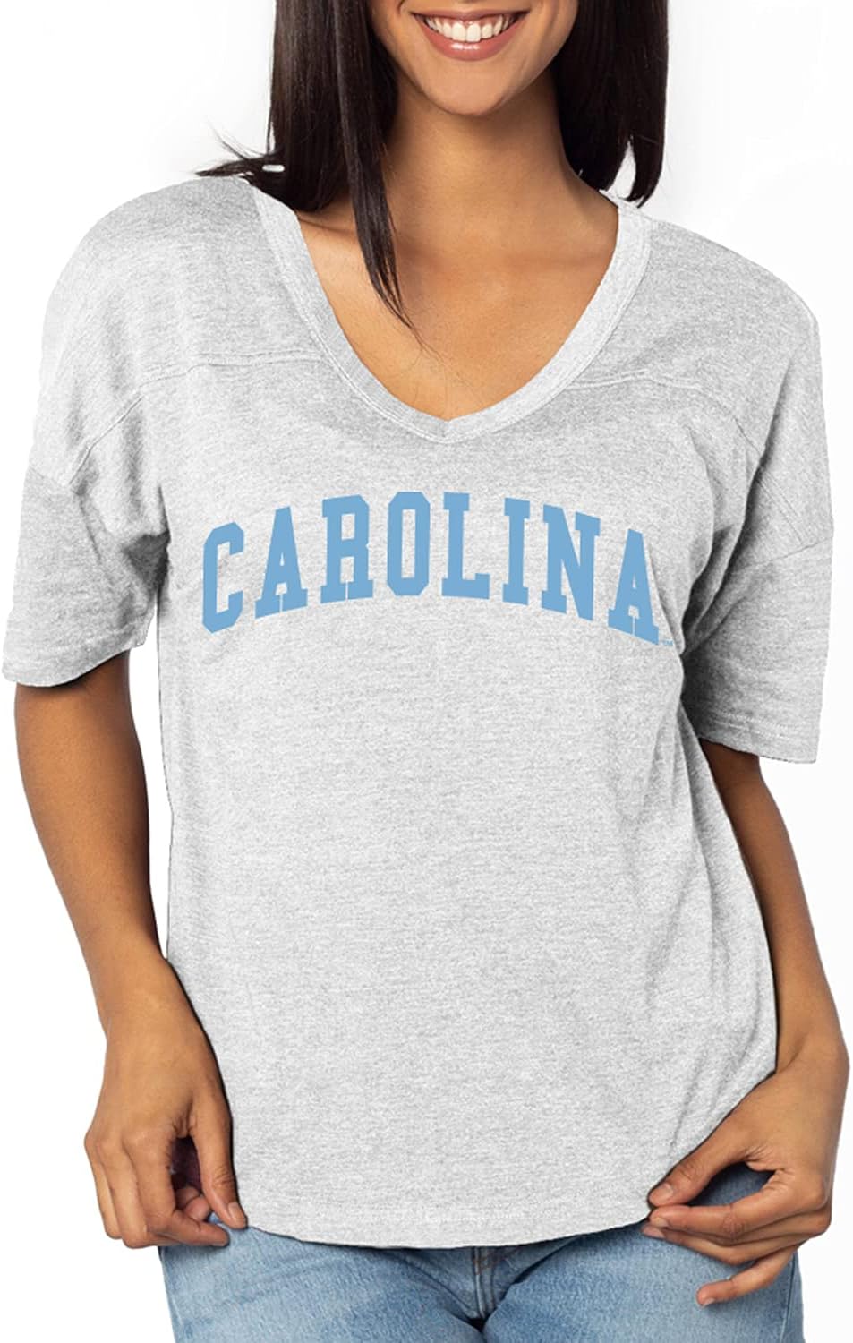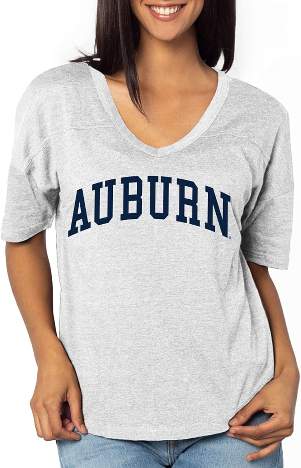 Look ready for game day in this jersey inspired silhouette. Feminine details include a rounded hem, yoke, v-neckline and longer short sleeves. Support your favorite team while staying on-trend with the NCAA officially licensed graphic.