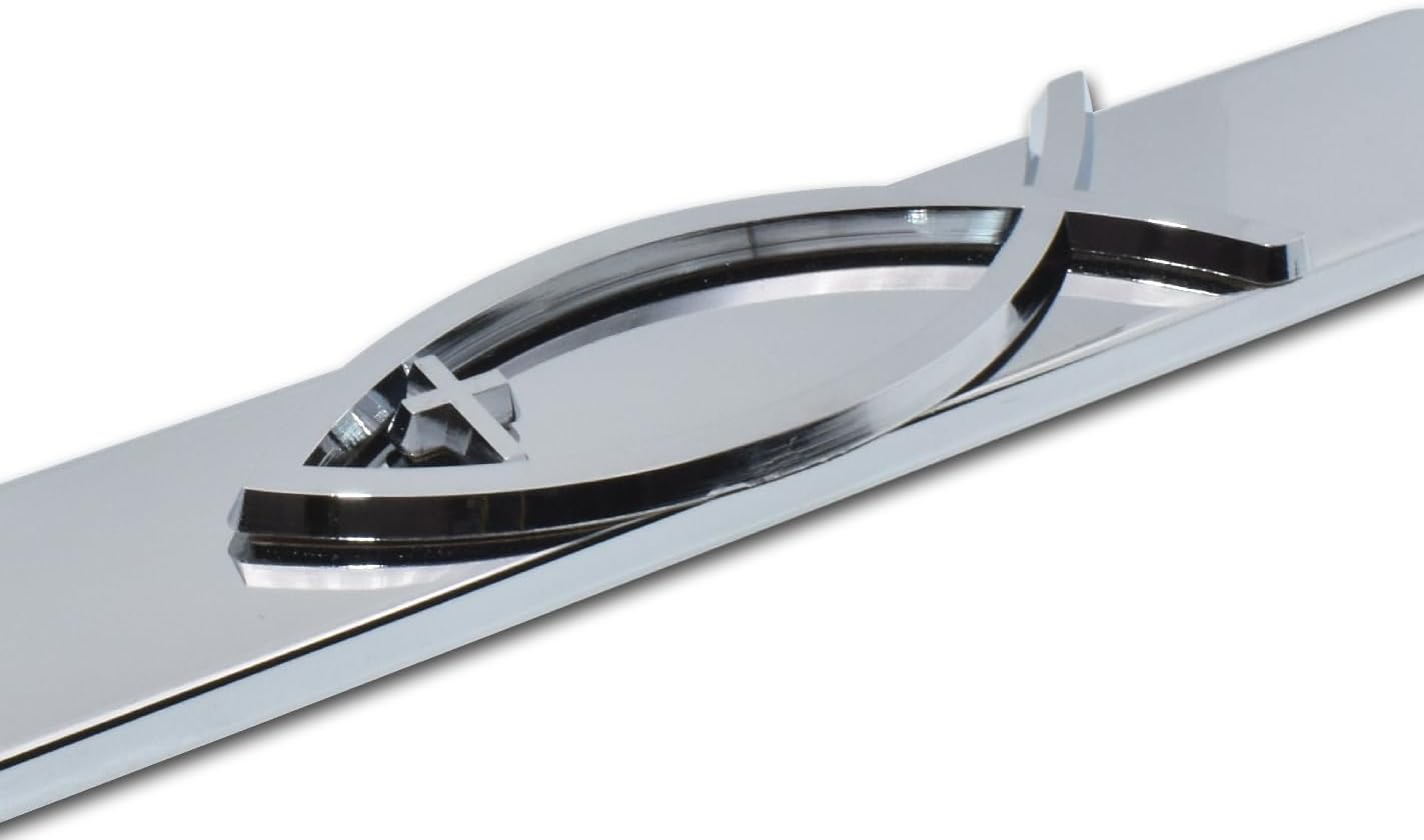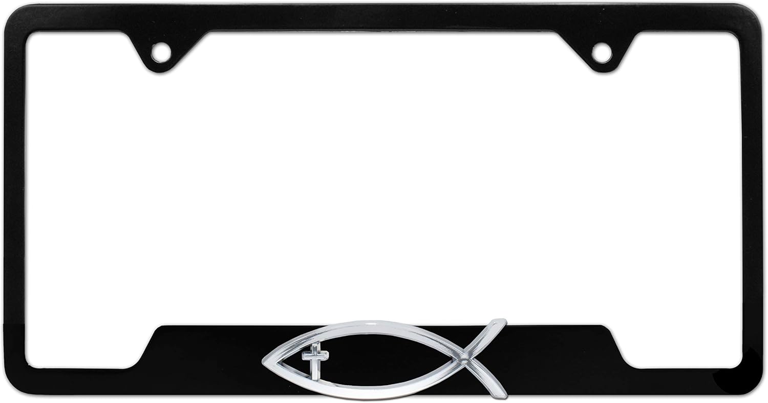 Add a spiritual touch to your ride and spread a message of faith with this elegantly designed Christian Fish Ichthys with Cross on a bright chrome metal license plate frame by Elektroplate. The all-metal frame with 3D chrome emblem affixed is built to endure the elements, ensuring it remains looking brand new for years without chipping or fading. Show the world that your faith is always with you, no matter where the road takes you. This standard size tag holder frame contains a full bottom bar ideal for states that require registration tags or stickers on the upper corners of the license plate, or for states that do not require tags on license plates. These states include AL, AK, AZ, AR, CA, CT, FL, HI, IL, KS, MD, MA, MI, MO, MT, NE, NV, NH, NJ, NY, OK, PA, TX, UT, VA, WA. Designed to fit 12" x 6" standard license plates.
