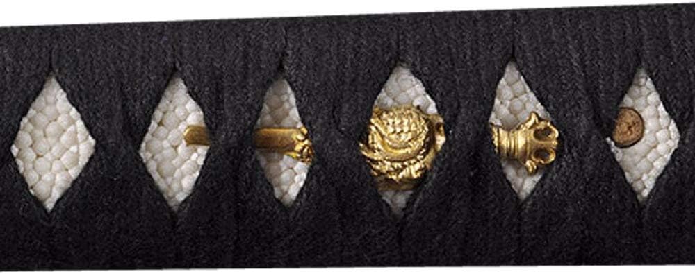 Steel: 1045 steel Blade: Heat tempered; Edge: Sharp; Hi(Blood groove): Hi on each side of the blade; Hamon(Tempered line): Real hamon; Tsuka(Handle): Genuine Ray Skin wrapped with Black Japanese cotton Ito & ornamented with Menuki (ornament); Saya: Brown lacquered wood tied with black Japanese cotton Sageo; Tang: Full tang with 2 Mekugi (peg); engraved with black smith's signature; Condition: Brand new & can be fully disassembled and assembled; Blade Length(with Habaki): 20. 75" Blade Length(without Habaki): 19. 75" Tsuba: Empire Wheel tsuba; Handle Length: 9. 75" Saya Length: 22. 25" Overall Length (with Saya): 32" Overall Length(without Saya): 31. 75" Weight(with Saya): 2. 2 lbs Weight(without Saya): 1. 7 lbs Package weight: 4 lbs Package Includes: 1 * Assembled Wakizashi Sword with saya 1 * Black Cotton Wakizashi Bag 1 * Tube Wakizashi Box
