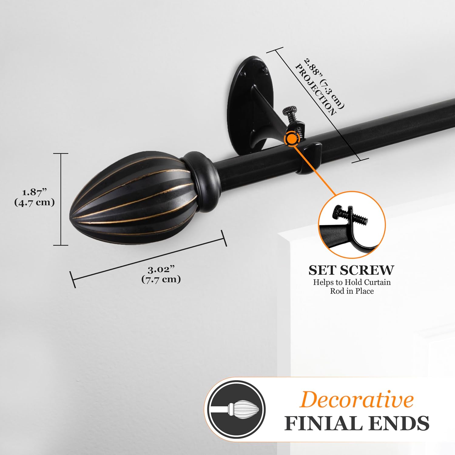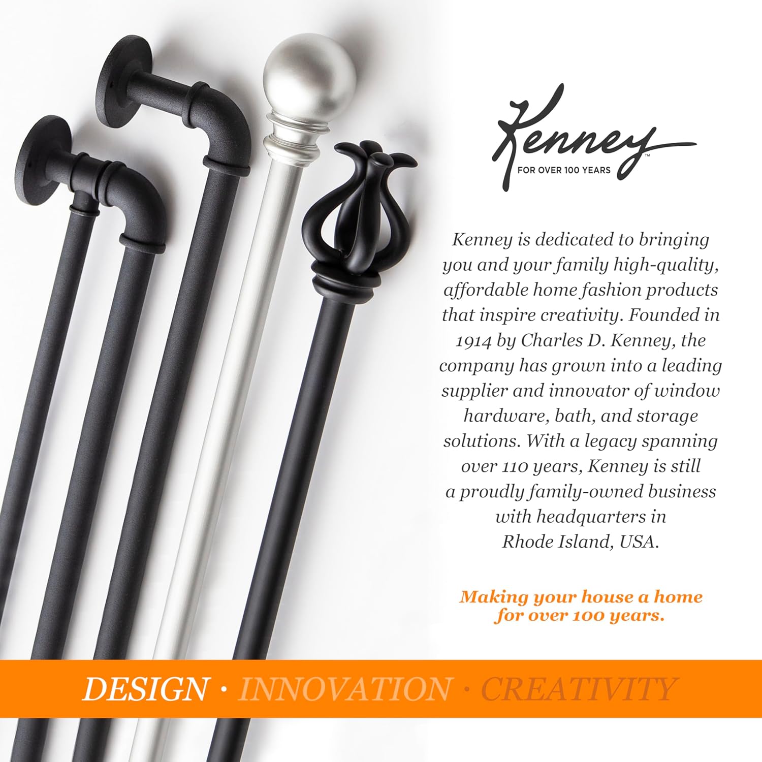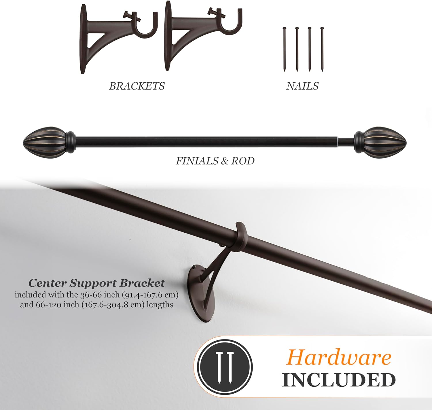 Product Description Introducing the Kenney Bailey Fast Fit Decorative Window Curtain Rod – a stylish and practical drapery solution designed for effortless installation and everyday elegance. Whether you're refreshing your living room, adding charm to your kitchen, or creating a cozy bedroom retreat, this adjustable curtain rod set blends functionality with refined design. The 5/8 inch diameter steel rod spans from 66 to 120 inches to fit a variety of window sizes and features oil-rubbed bronze elongated knob finial ends for a sophisticated touch. With Kenney’s innovative Fast Fit technology, installation is as easy as hanging a picture frame—no screws required, minimizing wall damage. Built to support up to 25 pounds, this rod is ideal for light to medium weight curtains and compatible with a wide range of curtain styles and accessories.Drapery Hardware Set Includes: one telescoping steel curtain rod with decorative elongated knob finials (3.02" L x 1.87" W x 1.87" H), two mounting brackets, one center support, nails, measuring template, and installation instructions.Kenney is a leading provider of window curtain rods and has a wide range of Single Curtain Rods, Double Curtain Rods, Spring Tension Rods, Closet Curtain Rods, Magnetic Curtain Rods, Blackout Curtain Rods, Bay Window Curtain Rods, Easy Install Curtain Rods, and Ceiling Curtain Rods. Whether you’re looking for a bedroom curtain rod, living room curtain rod, dining room curtain rod, home office curtain rod, or bathroom curtain rod, Kenney has you covered. Set Contains: Curtain Rod and Easy to Install Mounting Brackets
