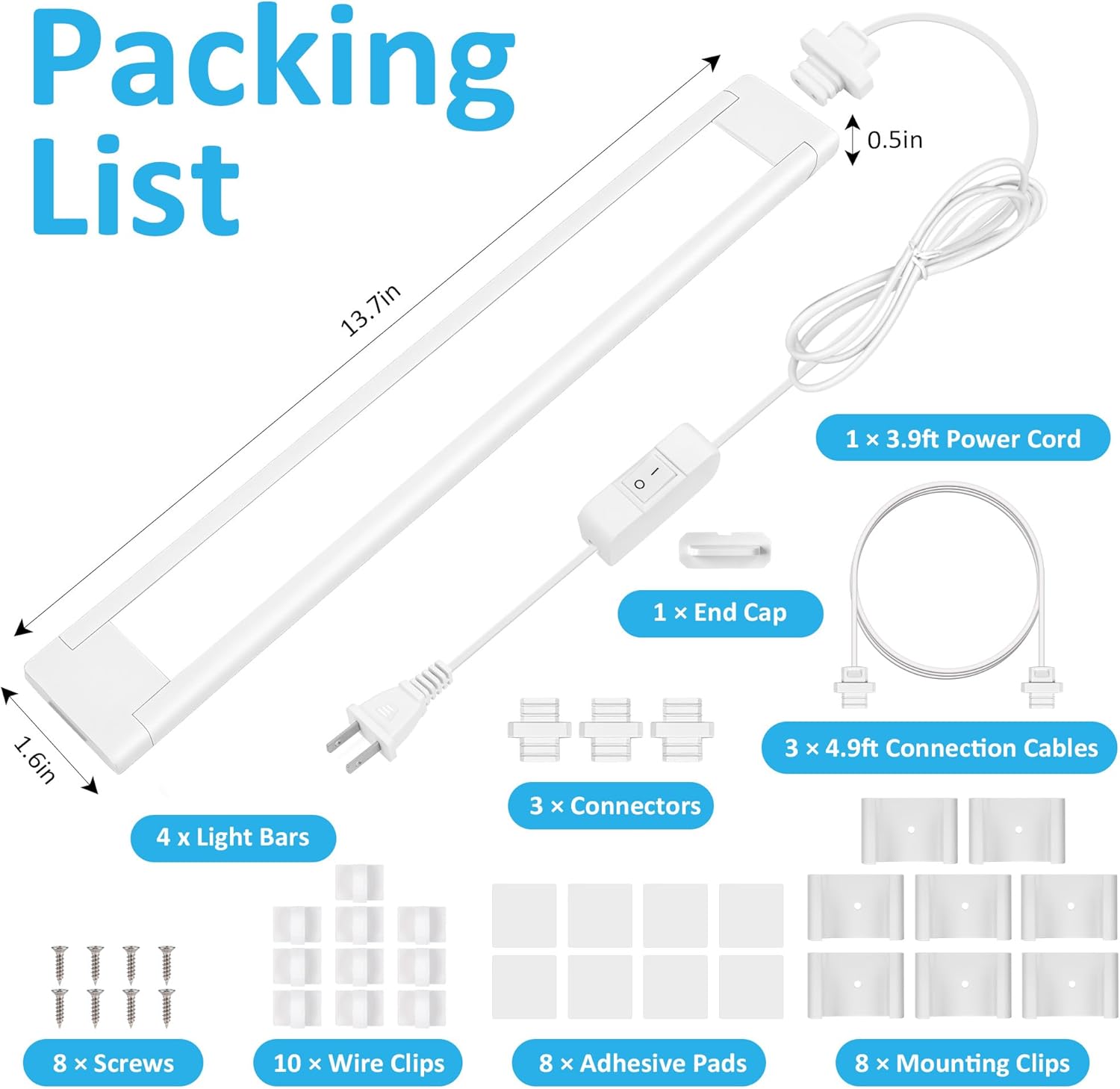 | Included Components | 1 × End Cap, 3 × 4.9ft Connection Cables and 3 × Connectors, 4 x 14in Light Bars and 1 × 3.9ft Power Cord, 8 × Adhesive Pads and 10 × Wire Clips, 8 × Mounting Clips and 8 × Screws |