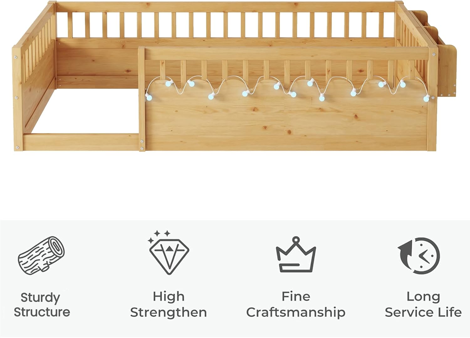 | Other Special Features of the Product | Light and Storage Shelf, Low to Ground Design, montessori bed with high rails |