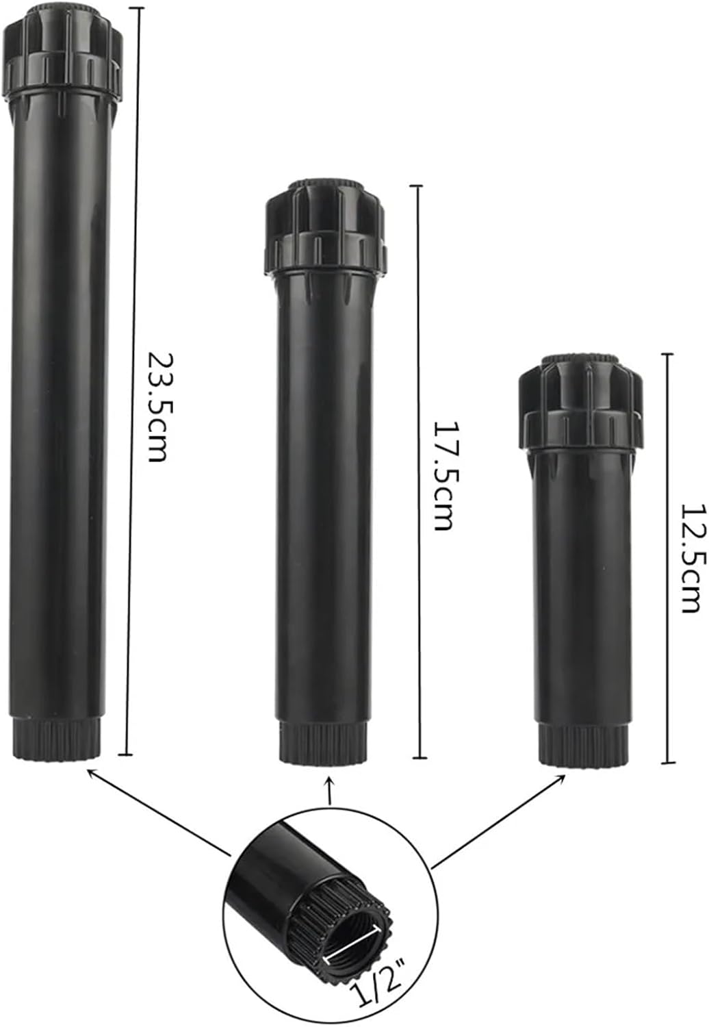 Versatile for Residential & Commercial Use:Perfect for both home gardens and professional irrigation systems, these pop-up sprayers adapt to various landscape sizes and types. Whether you’re maintaining a residential lawn, a commercial property, or a community garden, they provide reliable performance that meets diverse watering needsSpecification:Product name: Adjustable 0°~360° Popup SprinklerConnection Size: 1/2" Femal ThreadSpray radius: 3-5mWork pressure: 1.5-3KgFlow rate: 0.5-1.2 m³/HAppearance length: 12.5cm,17.5cm,23.5cmFeature: 0°~360° adjustableColor: BlackPacking include:5Pc x Adjustable 0°~360° Popup SprinklerFeatures:1. 0°~360° spray, Spray head is adjustable,covering large range, water droplets evenly2. Spray head is easy to install, and very convenient to clear pipe3. High elasticity spring, it can avoid leak effectively when water pressure is low. The inside spring is stainless steel, will not get rusty.4. Spray edge is clear, reduce wasting water and leak water.Notes: 1. There may be slight size deviations due to manual measurement, different measuring methods and tools. 2. The picture may not reflect the actual color of the item because of different photographing light, angle and display monitor.