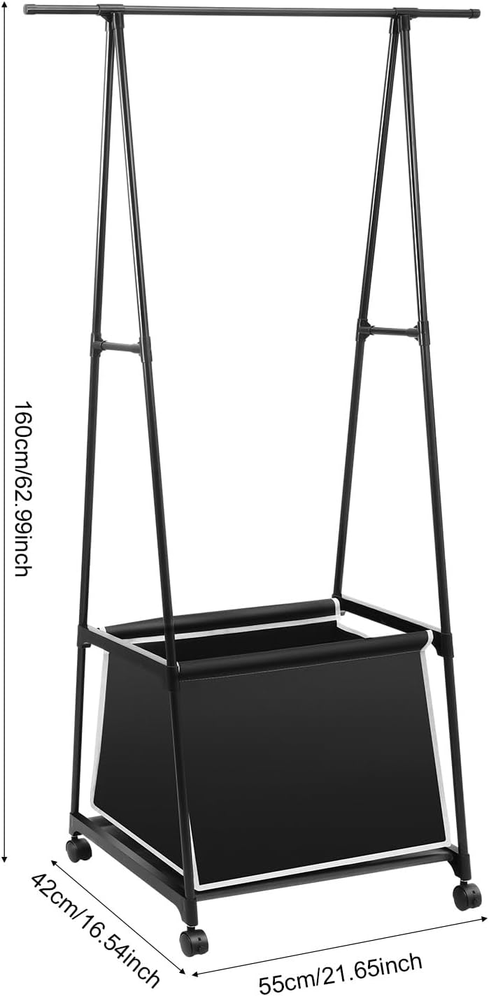 DetailsTriangular Frame: The stable triangular structure and the horizontal bars connected in between further enhance the stability of the product, allowing you to use it with peace of mind. Waterproof Laundry Basket: It can effectively safeguard your items from moisture and water.ApplicationIt is suitable for bedrooms, closets, laundry rooms, cloakrooms, boutiques, dormitories, hotels, etc. You can hang clothes, hats, scarves, bags, and other items on it, and use the storage basket to hold shoes, socks, gloves, small toys, etc.SpecificationMaterial: Steel, PP, Non-woven Laminated FabricProcess: Spray PaintingColor: BlackAssembly Required: YesMounting Type: FreestandingWheel Type: Universal Wheels(2 with Brakes)Total Load Capacity: About 15kg/33.07lbsPackage Size: 56*20*7cm/22.05*7.87*2.76inProduct Size: 55*42*160cm/21.65*16.54*62.99inGross Weight: 1.5kg/3.31lbsNet Weight: 1.42kg/3.13lbsPackage Included1* Clothes Rack4* Wheels1* English & Chinese Diagram